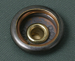 | このタイプの実物ドットボタンのバネは嫌になるほど固いのが通常です。打ち終わった後は実際の使用の前に、必ずワックス(蝋)を“Socket”のバネ及び“Stud”の上部突起に塗布し、固さが軽減する迄ボタンを何度も開閉し慣らして下さい。 注)固い状態での無理な開閉は生地(革)を損傷する可能性大です。十分注意下さい。固い状態での開閉にはマイナスのドライバーを“Socket”と“Stud”の隙間に差し込み開けることを勧めます。 |