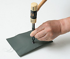 取り付ける生地(革)の取り付け位置に、各々のドットボタンに適した穴をポンチで開ける。下敷きにはゴム板等を使用。 ・ドットボタン(15.24mm):4mm径の穴(伸びのある生地、薄い革の場合は3.5mm径) ・DOT-Mini.(13.34mm):3mm径の穴(伸びのある生地、薄い革の場合は2.5mm径) |