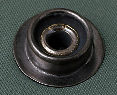 | 2) & 3) 同様に“Post”の足を予め開けた4mm径の穴に通し、“Post”の下を専用受け皿の裏(丸く平らに彫り込まれた方)にセットし、“Post”の足に“Stud”の穴を通し、“Post”の頭を打ち棒で叩き曲げる。 要領は全て3) に同じです。 |