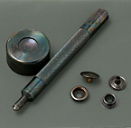 | 下記の取り付け案内は、ドットボタン(15.24mm)及びその専用打ち棒を使用しての紹介ですが、DOT-Mini.(13.34mm)の取り付けに際しての手順、注意事項も全て同様です。違いは、取り付ける生地(革)に開ける穴の径だけです。それぞれの穴の径は下記、手順-1)を参照下さい。 |