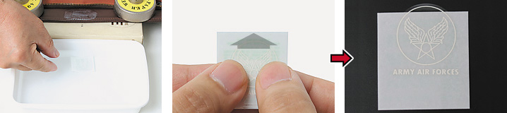 台紙からはみ出たデカール上部(約1cm)センターを水で濡らした指先で、接着剤を塗布した貼り付け面上部に軽く固定し、その状態で台紙を貼り付け面から浮かせないように沿わせながら、除々に真下に引き下げます(貼り付け面から台紙を浮かせた状態で引き下げると、デカールと貼り付け面の間に余分な空気が入ります)。完全に台紙がデカールから剥離したのを確認し、デカールが文字行も含め予め接着剤を塗布したエリア内に正しく置かれているか確認し、必要な場合は革面を滑らすように修正下さい。移動回転等の修正が困難な場合は貼り付け面及びデカール全体を水で濡らし修正下さい。