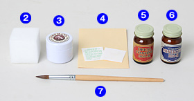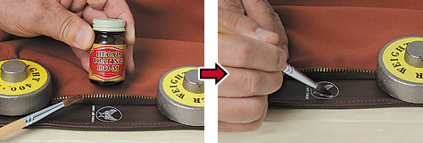 | 約10〜15分間の自然乾燥を終えれば直ちに、デカールのコーティング作業を行います。貼り付けたデカールを革面により強固に密着させ、表面を保護し、早期の剥離を防止するための大事な作業です。 同封されたコーティング液“Decal Coating 1043-M”を容器ごと良く振り撹拌してから、同じく同封された細幅の筆、又は市販の毛先の柔らかい筆で、デカール表面に薄く均一に塗布します。 |