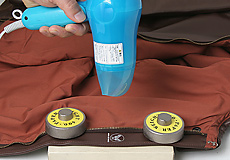 上記の作業を終えれば直ちに、ドライヤーによるコーティング液の乾燥、及びデカールの革面への密着作業を行います。ドライヤーで真上(約10センチ程離し)からデカールに少し熱めの温風(指先が若干熱く感じる程度)を吹きつけ、デカール表面に塗布したコーティング液を乾燥させながら温風でデカールを貼り付け革面へ密着させる感じで作業を行います。完全に乾ききる迄行って下さい。