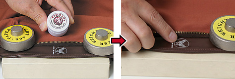 | 全ての作業終了後、約10分間程放置し熱を冷ました後、同封(又は別売)の保革クリーム“Red Man's Natural Horse Oil”をデカール面及び周囲の革に指先で薄く伸ばし均一に塗布し、余分なクリームを布、ティシュ等で拭き取り、完成です。 | ||