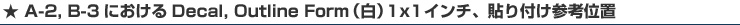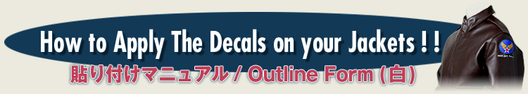 | 縦横1インチの Outline Form(白)Decal はAAFの認識マークとしてFull Color(4色)Decalよりも広範囲に使用され、その対象も革製のフラィング・ジャケット、 フラィング・トラウザーズ、フラィング・グラブズ、フラィング・キャップと多岐にわたります。ここでは、その代表格としてA-2, B-3における貼り付け基本位置を、下に案内させて頂きます。実物の貼り付け位置に、かなりの差異があることはFull Color(4色)同様です。含み参照下さい。 | |||||