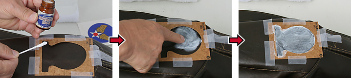 上記の作業を終え、貼り付け面の湿り気が乾かない内に、同封(又は別売)の接着剤“Meyercord 1036-R”を指先で、型紙枠内に均一に塗布下さい。