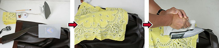 | 上記の作業を終えれば直ちに、アイロンによるデカールの革面への密着作業を行います。アイロンは必ず温度調節可能でスチーム機能の付いていないタイプを用意下さい。温度設定は『絹と毛の中間』又は『中温と低温の中間』(約120度℃位)です。小型のアイロン台、又は、厚手の本、板等を下敷き、ある程度圧力をかけても貼り付けたデカール面が沈まないようにし、貼り付けたデカールの上に“半透明のリケイ紙-A5サイズ”をデカールが中心になるように置き、その上にあて布(綿製のハンカチ等)をあて、少し圧力をかけた状態(小型アイロンの場合、約12〜15kg程度)で約10秒、加熱・加圧下さい。 |