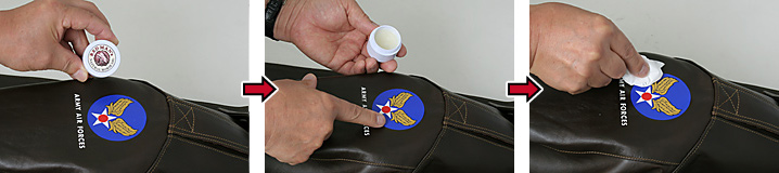 | 全ての作業終了後、約10分間程放置し熱を冷ました後、同封(又は別売)の保革クリーム“Red Man's Natural Horse Oil”をデカール面及び周囲の革に指先で薄く伸ばし均一に塗布し、余分なクリームを布、ティシュ等で拭き取り、完成です。 | |||