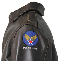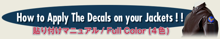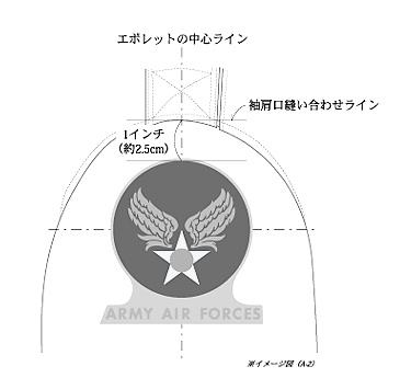 | AAFにおける革製のフラィング・ジャケット、メカニックス・ジャケットのDecal(4色)貼り付けの基本位置は、左袖外中心線にデカールの中心を合わせ、袖肩口縫い合わせラインから1インチ(約2.5cm)下がった位置にデカールの頂点がくるように合わせます。但し、実物においては、かなりの差異があるようです。最終的には個人の好みを加味し決定下さい。 参考までに、A-2, B-3における貼り付け基本位置を案内させて頂きます。参照下さい。 |