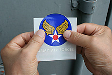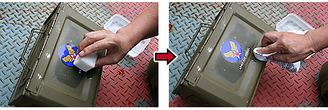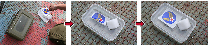 | 上記の作業を終えれば直ちに、スポンジに水を充分含ませ(滴らない程度)デカールと貼り付け面の間の空気、余分な水分を押し出す作業を行います。水抜き、空気抜き作業は圧力を掛けずスポンジに含ませた水の重さを利用しデカールの中心部から外側に向けスポンジを撫でるように移動させ行います。この際、デカール面に出来た小ジワ等の修正も若干は可能ですが、透明部分(上の円形のロゴ部分と下の文字行を繋いでいる部分及び文字周辺)に出来たシワの修正は最低限度に留めおき、無理に取ろうとしないで下さい。透明部分は強度的に劣るため無理なシワ修正は破れに直結します。若干のシワは乾いていく過程で目立たなくなります。この作業を行う際はデカールの表面は常に濡れた状態に保って下さい。 余分な水を拭い取り、完全に乾くまで(夏季:約2時間、冬季:約3時間)放置乾燥下さい。 |