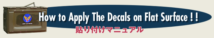 | 台紙からはみ出たデカール上部(約1cm)センターを水で濡らした指先で、貼り付け面センター上部に軽く固定し、台紙を貼り付け面に置くように沿わせながら(浮かせないように)、ゆっくりと(デカールを破かないよう注意しながら)除々に真下に引き下げます(貼り付け面から台紙を浮かせた状態で引き下げると、デカールと貼り付け面の間に余分な空気が入ります)。完全に台紙がデカールから剥離したのを確認し、必要な場合は移動させたい方向の貼り付け面及びデカール全体を水を含ませたスポンジ等で充分濡らしてから修正下さい。 | ||