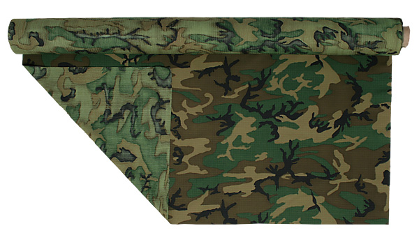 | 今回の制作で使用された『ERDL Camo実物生地』。NAM戦以降継続使用された迷彩柄と混同される事が多いが、両者は似て非なるものであり、幾つかの違いがあるが、最も大きな違い特徴は、68-70年にかけ支給された迷彩生地は画像のようにプリントが裏面に浸透しており、これは60年代に多用された染料、プリント手法の特徴である。この事はNAM戦時に極東で調達されたタイガーのプリントに関しても同様の特色が多く見られる。対し70年代中頃以降にプリントされた迷彩柄には殆どこの特徴が見られ無い。 |