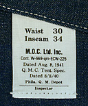 通常ミリタリィにおけるデニムパンツで多く現存し、知られる物には、ARMYでは1920〜1930年頃製造された、バックに調節用ベルト(シンチバック)がついた型式の物があり、又 NAVYは多くの型式のデニムパンツを40年代採用使用しました。