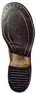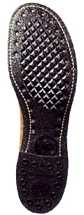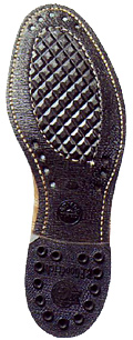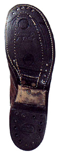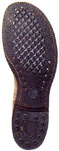 ヒールに関してはTYPE I では茶色のラバーヒールも多く使用されたが、TYPE II 以後は全て黒のラバーヒールが用いられた。その表面のトレッドデザインは軍で規定された形跡はなくメーカー名あるいはそのトレードマークがヒール・トレッドとして象られた物が多い。ヒール固定用釘穴の数は常に13(片側)でありその位置も各メーカー共通であることから釘穴に関しては規定されていたようだ。ヒールに関しては TYPE II、TPE III、バックルブーツの全てにおいて同型式の物が多く使用され、NAVYの物にも多く見られる。又、空挺ジャンプブーツのヒールはジャンプ時のひっかけ防止のためヒール前部は通常の物のようにはカーブせずストレートであり、そして斜めに勾配が付けられていた。MCのラフアウトブーツに使用されたヒールは取付釘ガイドホールのない物が多く、これはMCの主作戦地が多湿の太平洋戦線であったため釘ガイドホールからの水の進入を嫌った物だと考えられ、又、材質的にもMCのソール、ヒールは他の物と異なり、成型時に滑り止め用に細かくシュレッドされた綿布などが混入された物が多かったようだ。 |