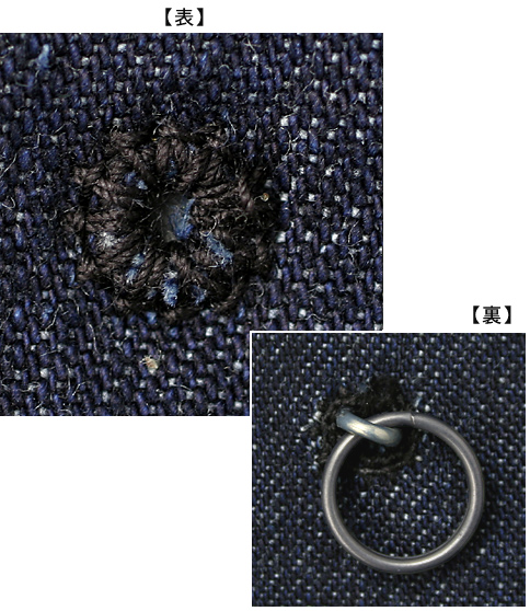 ステッチでかがられたボタン取り付け用の菊穴(アイレットワーク)、内径3mmの穴にボタン足が通され裏留リングで固定される。