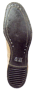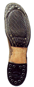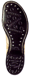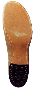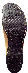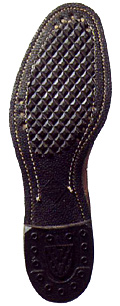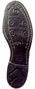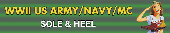 ヒールに関してはTYPE I では茶色のラバーヒールも多く使用されたが、TYPE II 以後は全て黒のラバーヒールが用いられた。その表面のトレッドデザインは軍で規定された形跡はなくメーカー名あるいはそのトレードマークがヒール・トレッドとして象られた物が多い。ヒール固定用釘穴の数は常に13(片側)でありその位置も各メーカー共通であることから釘穴に関しては規定されていたようだ。ヒールに関しては TYPE II、TPE III、バックルブーツの全てにおいて同型式の物が多く使用され、NAVYの物にも多く見られる。又、空挺ジャンプブーツのヒールはジャンプ時のひっかけ防止のためヒール前部は通常の物のようにはカーブせずストレートであり、そして斜めに勾配が付けられていた。MCのラフアウトブーツに使用されたヒールは取付釘ガイドホールのない物が多く、これはMCの主作戦地が多湿の太平洋戦線であったため釘ガイドホールからの水の進入を嫌った物だと考えられ、又、材質的にもMCのソール、ヒールは他の物と異なり、成型時に滑り止め用に細かくシュレッドされた綿布などが混入された物が多かったようだ。 |