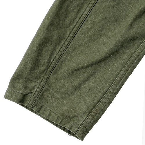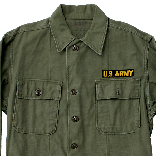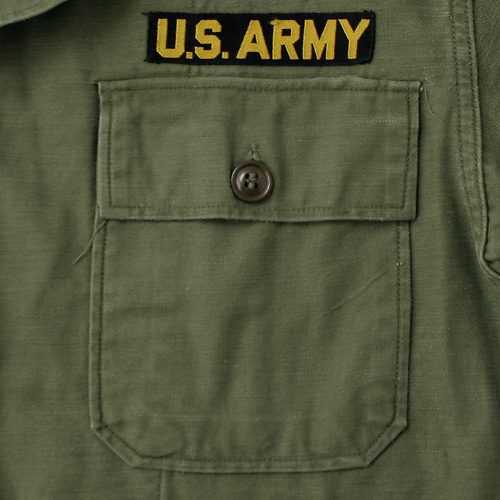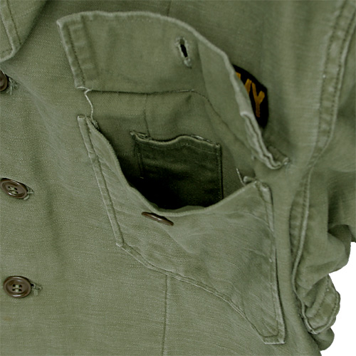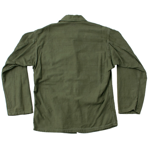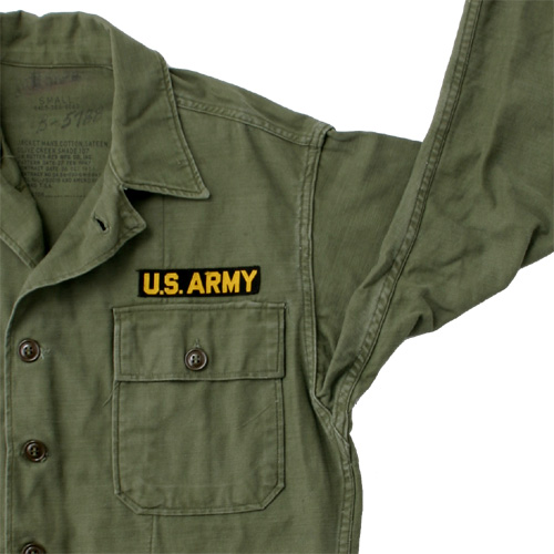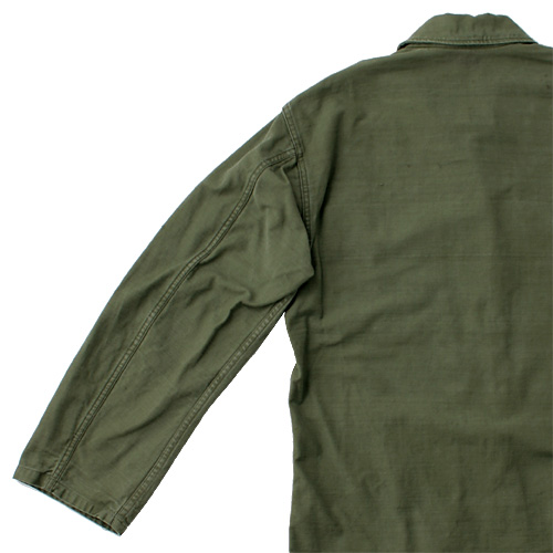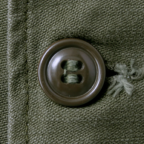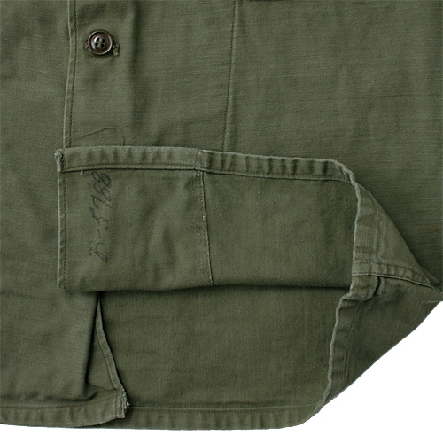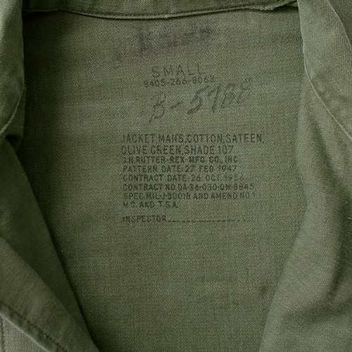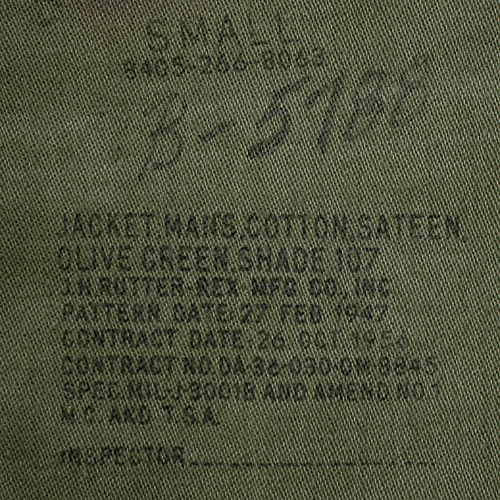 1950年代半ば、米軍は主戦闘服使用生地を『HBT(ヘリンボーンツイル)』から『Cotton Sateen, OG 107』に変更した。変更当初はパターン、縫製仕様、共に前身『M-47 HBT ジャケット』のものが用いられ、初期の数年はタイプ名も『OG 107 Sateen Jacket』とされていたようだ。60年以降の『1st Model(後期)』との違いは、コントラクト内容がラベルではなくスタンプ表示されていたこと、使用されたボタンがODでなく茶色であったこと位で、他は殆ど初期、後期の差はないようだ。紹介のジャケット(シャツ)は変更されて間もないコントラクトの物と思われ、『筒袖・1st Model(初期)』の特徴全てを見ることができる。
