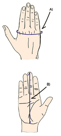 How to measure your hand A) Measure the circumference around your knuckles at your bigger hand, while holding your hand flat. B) Measure the length at the center of your palm at your bigger hand,while holding your hand flat. tip) Right-handed person's right hand is usually bigger than left hand. left-handed person is opposite. How to choose your glove size. Please choose your glove size at line A) and line B) of the below size chart. Line A) is indicated the fit measurement of the circumference around knuckles at each glove sizes. Line B) is indicated the fit measurement of the length at the center of palms at each gloves sizes. Then, choose the bigger size from the sizes you choose from line A) & line B). The size you choose is supposed to be your orderings size. |
