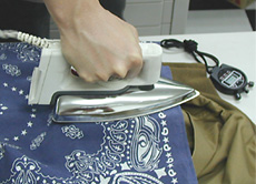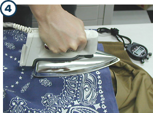 Put the iron on the cotton pad gently from above. At this time, never move the iron back and forth. Start press-fitting at the print position. It takes 12 to 18 seconds to press-fit the insignia perfectly. Then remove the iron from the cotton pad. Sometimes, the cotton pad itself may be tightly press-fitted as well because of heat.