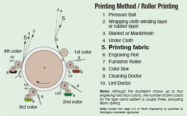 It's precisely the characteristics of the roller printing method that have given rise to the many tiger print variations. Roller printing is the oldest of all machine-based printing methods for fabric, hence the name "Machine Printing", or simply "Machine". The method involves running the fabric against a large cylinder, around which a roller (4-8 inches in diameter) with a pattern engraved on its surface rotates. The ink collects in the depressions of the roller, which then transfers to the continuously moving fabric, forming the print. One roller is required for each color, and as many rollers as there are colors. The diameter of the roller plays a major role in tiger variations. Since the pattern engraved on the cylinder's surface is printed endlessly as it rotates, the roller's diameter multiplied by pi determines the pattern pitch (feed width). Using different diameters roller makes it impossible to print the same pattern. Typically, print factories use rollers of a convenient width and diameter, rarely using different types of rollers. Therefore, in order to print at a different printing factory, the pattern had to be adjusted to fit the rollers used at that factory. It was sometimes necessary to select the fabric to be used based on the width of the rollers used.