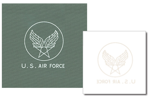 | This US AIR FORCE insignia is a special printing based on the military specifications (MILSPEC). It can only be printed on materials such as nylon or cloth because of its special ink that melts into their textiles for bonding. Therefore it is not available for other materials such as leather, rubber, vinyl or plastic. Since the insignia is printed in a different manner from general sea1 insignias, should carefully be read manual before printing. |