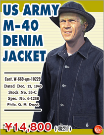プルオーバータイプのM35に続き1940年採用された『US ARMY M40デニムジャケット』。長くシャープな襟形、フラップ付きのフロントポケットが特徴だ。初期のものにはM35同様17mmメタルボタンが使用され、後期のものには月桂樹模様ドーナツボタンが多く使用された。M40初期モデル完全復刻版、堂々の完成です。