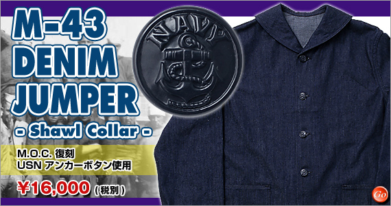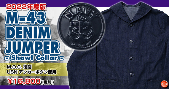 ARMYに数年遅れ採用されたNAVY デニムジャケットのフロントにはNAVYの文字とアンカー(碇)のロゴがデザインされた取り外し可能な足つき樹脂ボタンが付けられ、セーラーの襟デザインを基に設計されたと考えられる独特の襟を持つ、このジャケットの復刻の元となったオリジナルは、ラベルに記入されたコントラクトナンバー(NXs 14575)から1943年発注の物と推定される。