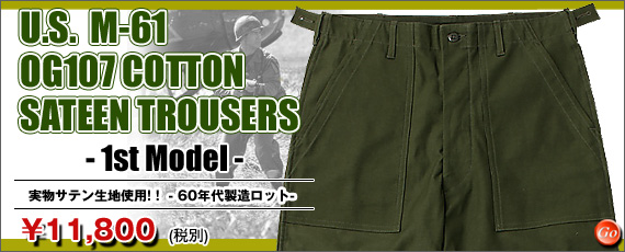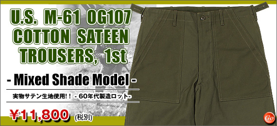 2013年8月『OG107 SATEEN SHIRTS』復刻時、紹介した《50-70s, OG107 SATEEN SHIRTSの変遷》で便宜上名付けた『筒袖・1st Model(後期) 60-63年』と共に支給された『OG107 Sateen Trousers, 1st Model』。後継Modelとの外観上の大きな違いは 腰部両サイドに設けられたアジャスタータブの有無である。日本の古着好きの間では『ベイカーパンツ』と呼ばれることも多いようだが、実際には純然とした米軍戦闘ズボンである。コンディションの良い実物は殆ど見かけなくなった昨今『OG107 SATEEN SHIRTS』同様『60年代米軍実物コットンサテン生地』を用いてのフルリプロデュースです。